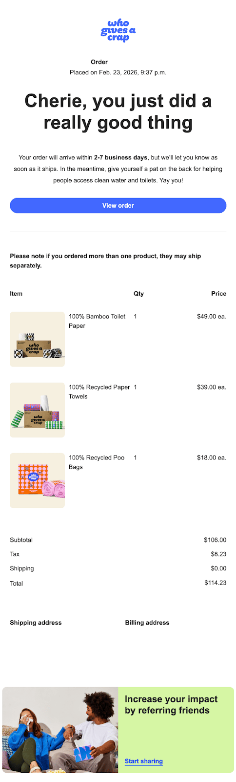 What to send them: Make reordering dead simple with one-click reorder links or subscription offers. Once that's established, you can gently introduce adjacent products without pushing too hard or overwhelming them with options.