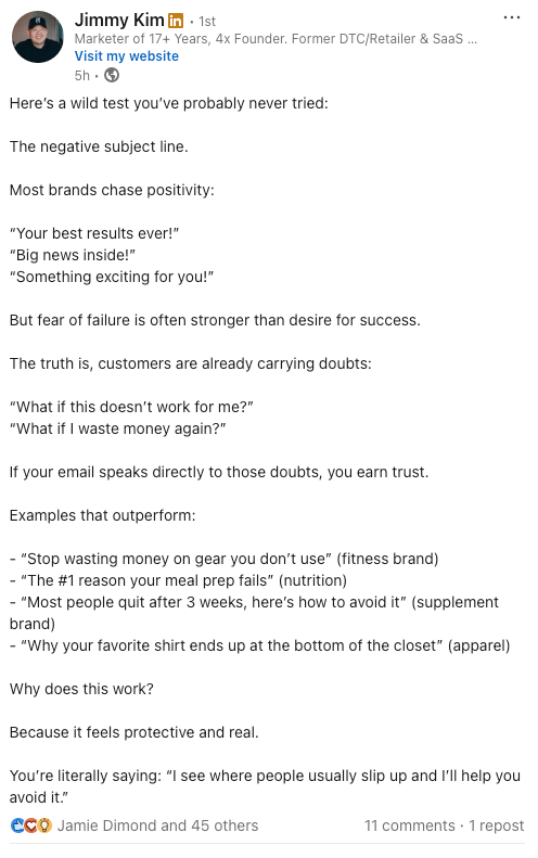 Most brands chase hype and positivity. But sometimes, the best hook is the negative one. Jimmy shares why leaning into doubt can earn more trust (and more opens).