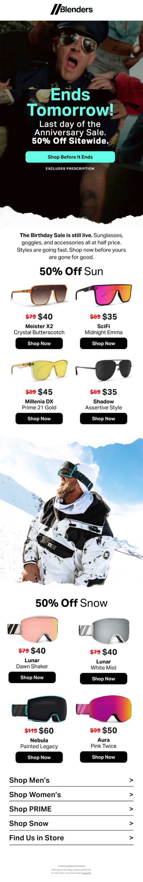Blenders doesn't do quiet sales. The brand built its identity on bold colors, party energy, and affordable eyewear, and their 14th birthday sale leans fully into that personality with celebration imagery, sweepstakes gamification, and relentless urgency messaging.