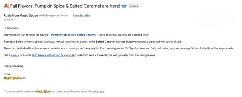 Magic Spoon’s fall flavor campaign is a textbook example of brand consistency meeting seasonal storytelling. Every email looks good enough to eat… but beneath the design, the real win is how they extend a simple flavor drop into weeks of engagement.