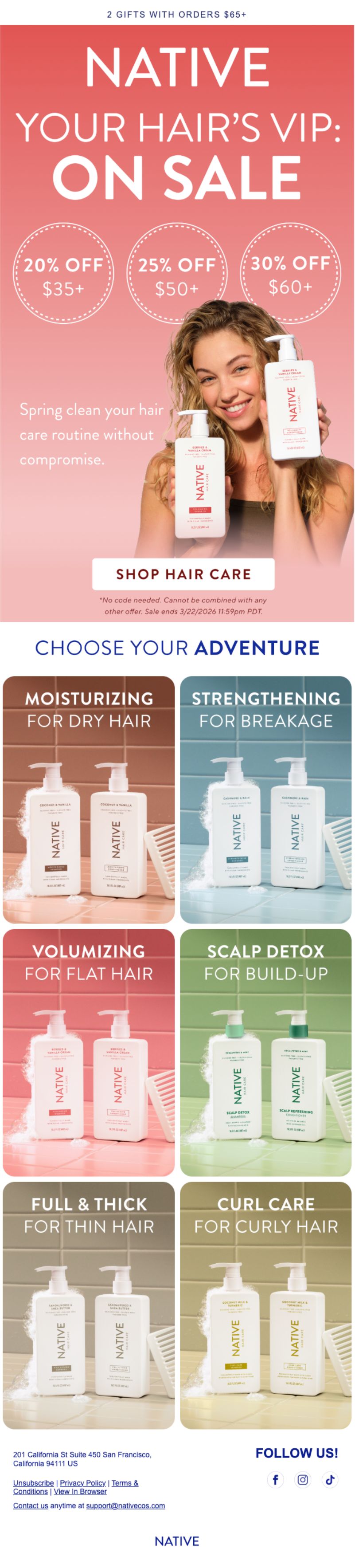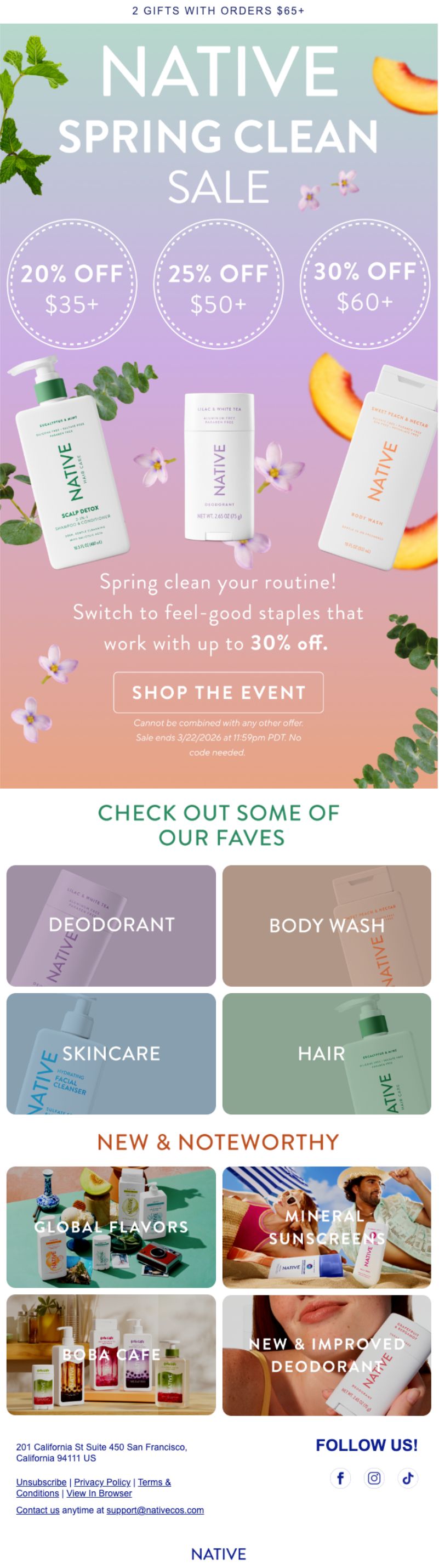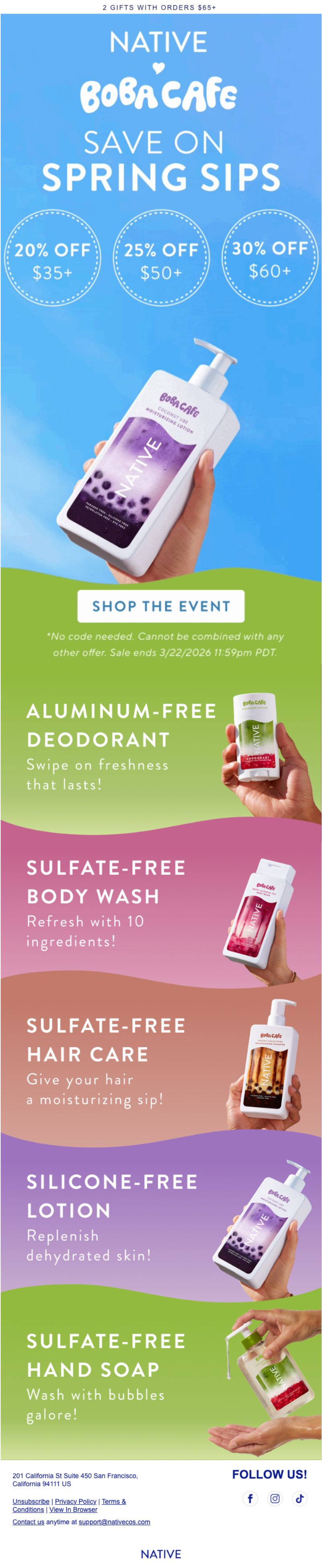 Native sells natural personal care products (deodorant, body wash, shampoo, sunscreen) positioned around ingredient transparency and accessible pricing. Their spring sale doesn't just discount; it uses tiered pricing to drive cart value and category-specific emails to guide shoppers through routine building.