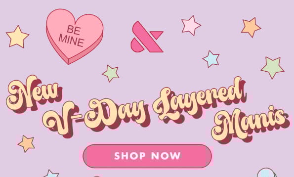 The headline immediately signals novelty. “New V-Day Layered Manis” tells you this isn’t just another shade drop. There’s something new to try.