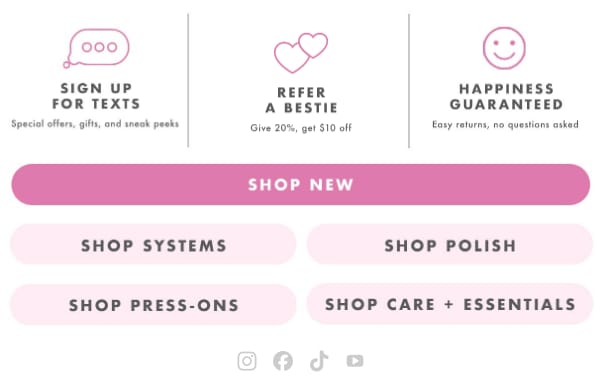 One final recap CTA like “Shop Layered Mani Looks” could help anchor late scrollers who made it through the full email.