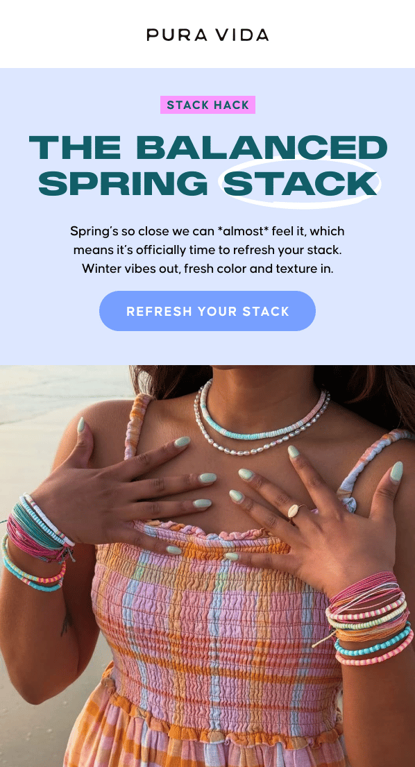 Spring has sprung in the inbox and Pura Vida's "spring stack" email shows exactly how to tie seasonal transitions to product styling.