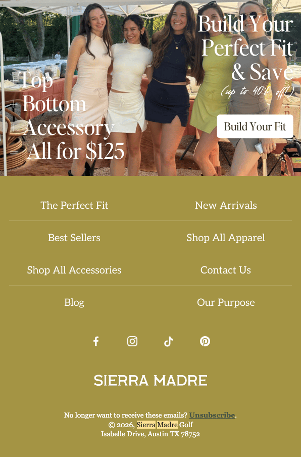 This monthly send turns real outfits into social proof, shows how their pieces work on and off the course, and quietly doubles as an outfit builder. It’s even more proof that community can be one of your strongest conversion levers.