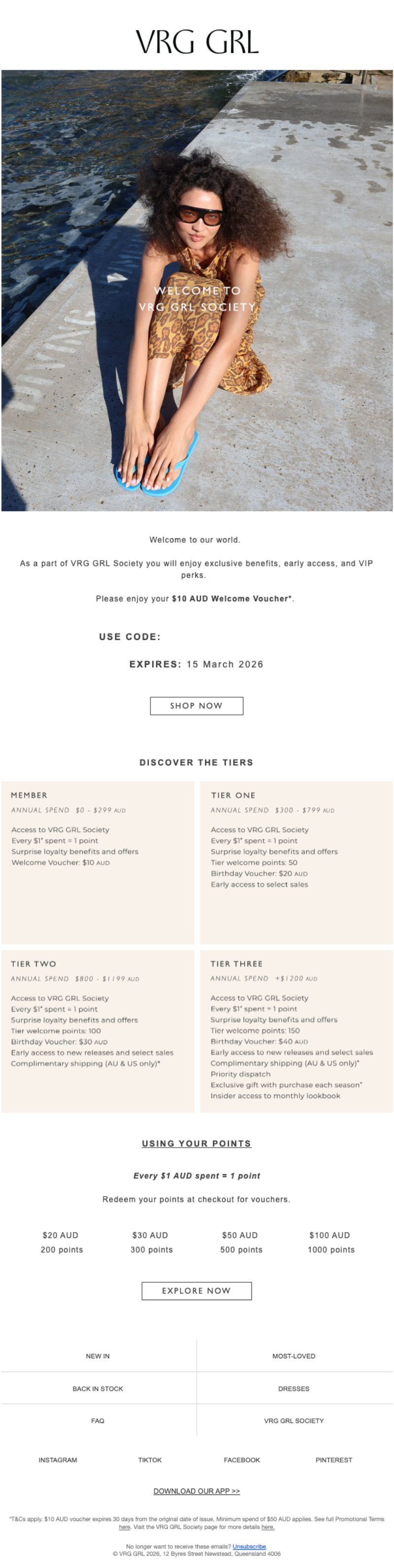 VRG GRL successfully positions their points program as exclusive society membership rather than transactional rewards. The flow builds relationship through brand story, clear communication, and ongoing engagement opportunities.