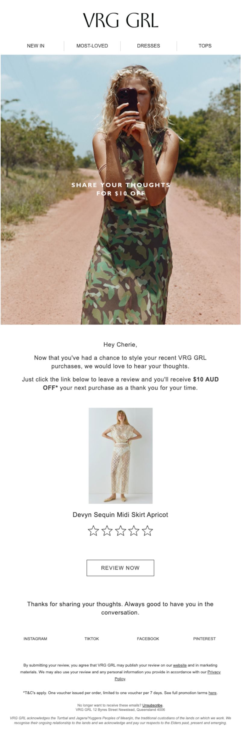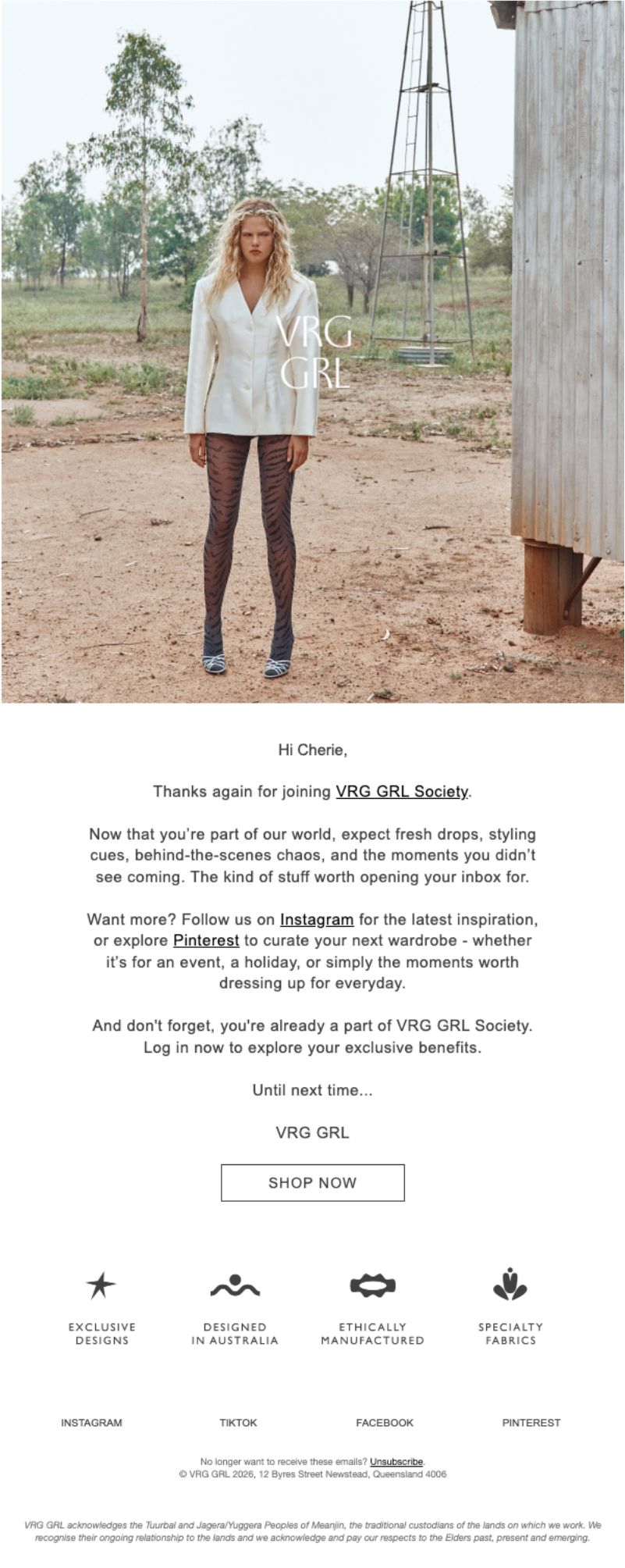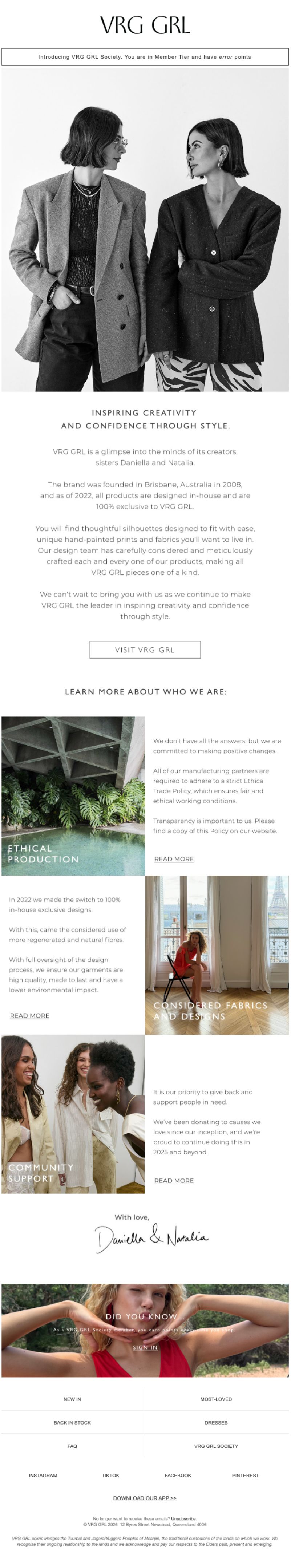 VRG GRL is an Australian women's clothing brand that positions itself around exclusive designs, ethical manufacturing, and specialty fabrics. But what stands out in their post-purchase flow isn't the product pitch; it's how they turn transactional moments into relationship-building opportunities.